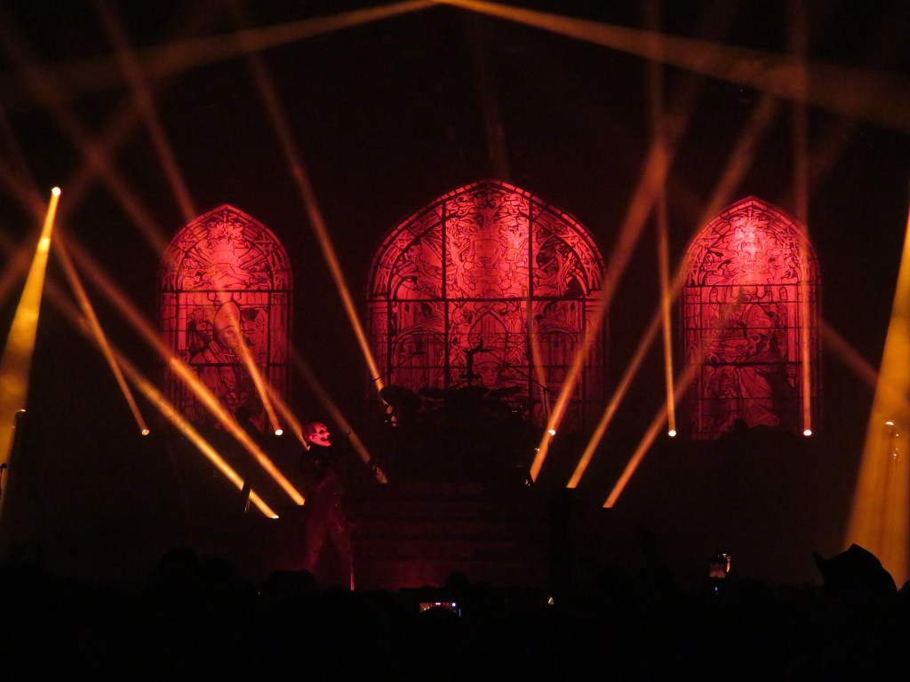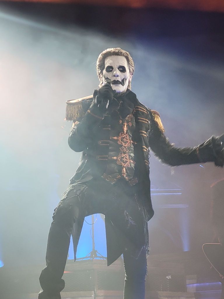 The crowd became nearly unhinged as the lights quickly dropped, and the familiar sound of “Klara stjärnor” began to play over the speakers. Our eagerness became jitters, and fans quickly whipped up their phones for a chance to snag the moment when Ghost would hit the stage. “Kaisarion” began with a tremendous bang from the canons; the white curtain dropping to reveal Papa in all his majesty, belting it out as fans lost their minds.