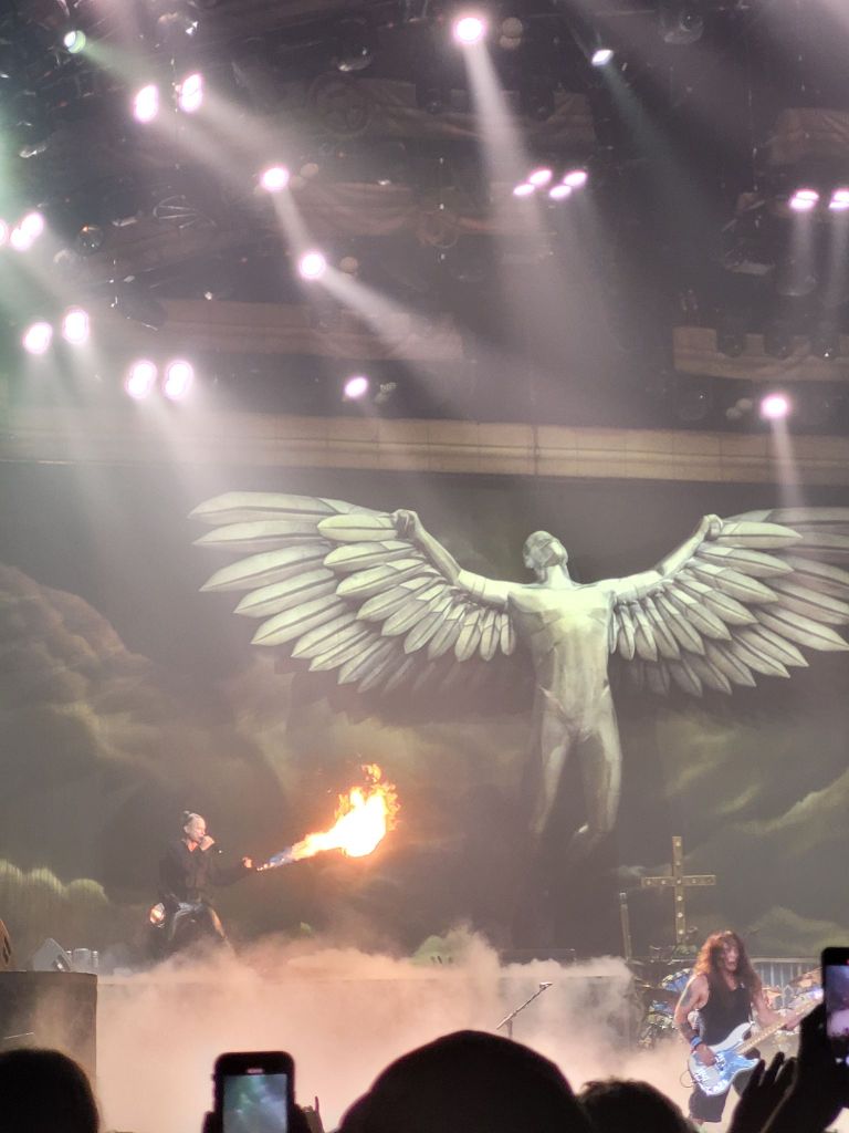 But, it wasn’t until “Flight of Icarus” kicked off that fans really got the ‘wow’ as a giant Icarus figure backed the stage, and Bruce came out wielding a set of flame throwers that he happily showed off throughout the performance. At the end, Icarus dropping from the sky, having folded his wings in defeat, blew the minds of fans both on the floor and in the stands. But, that was only the beginning….