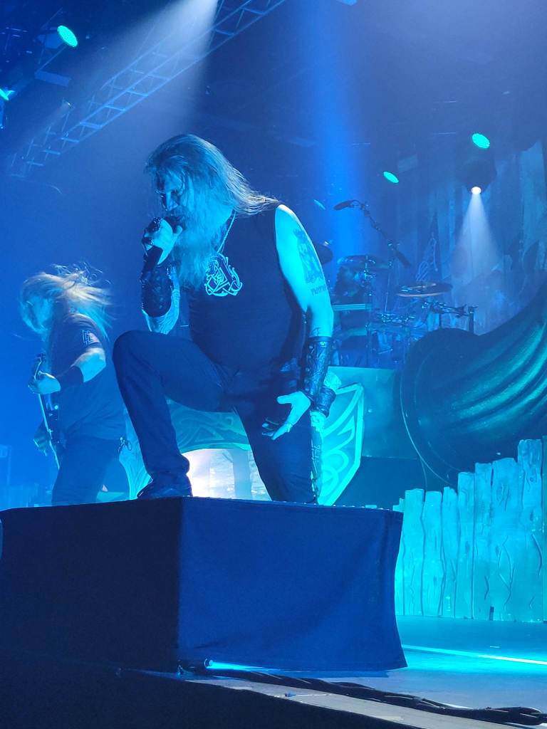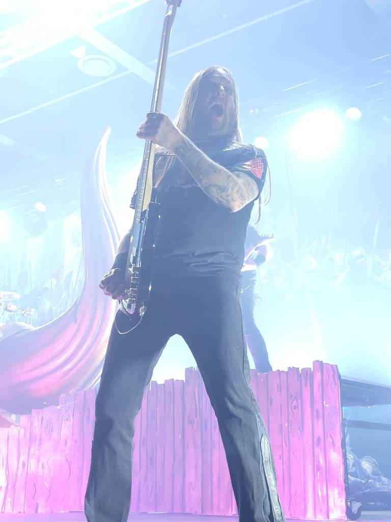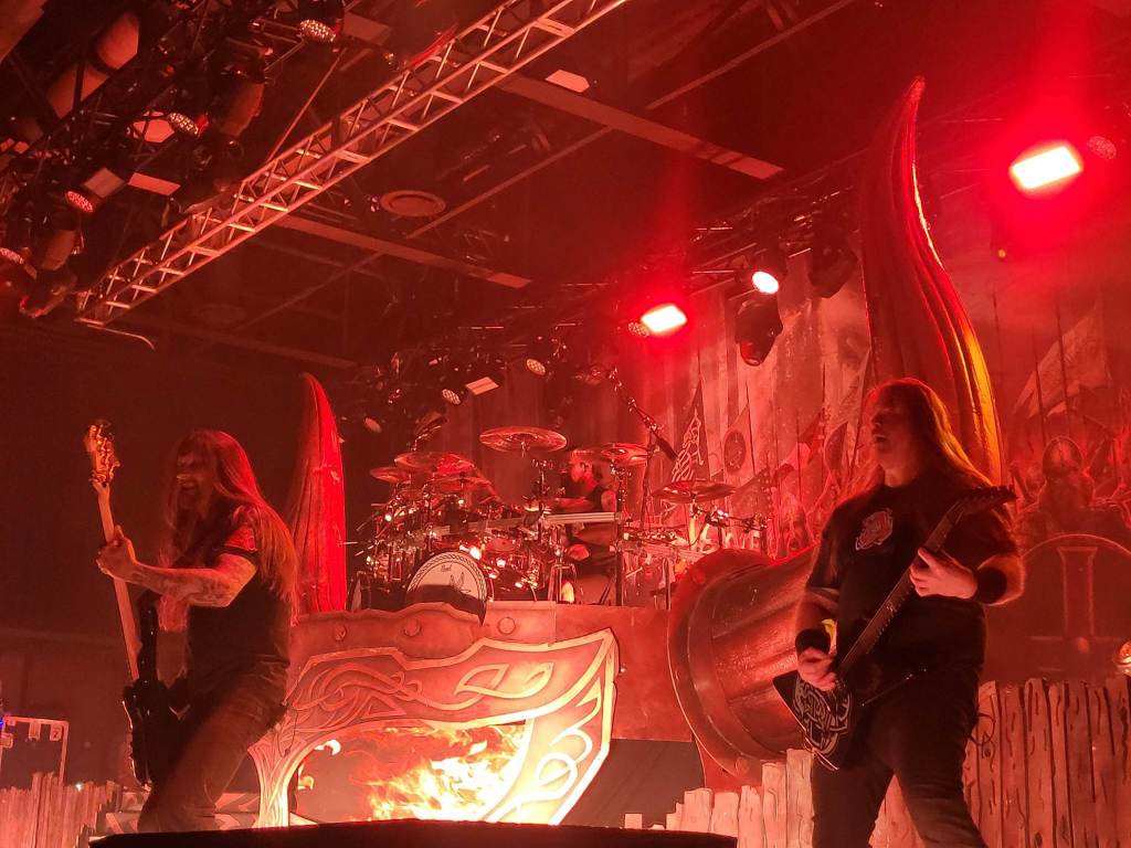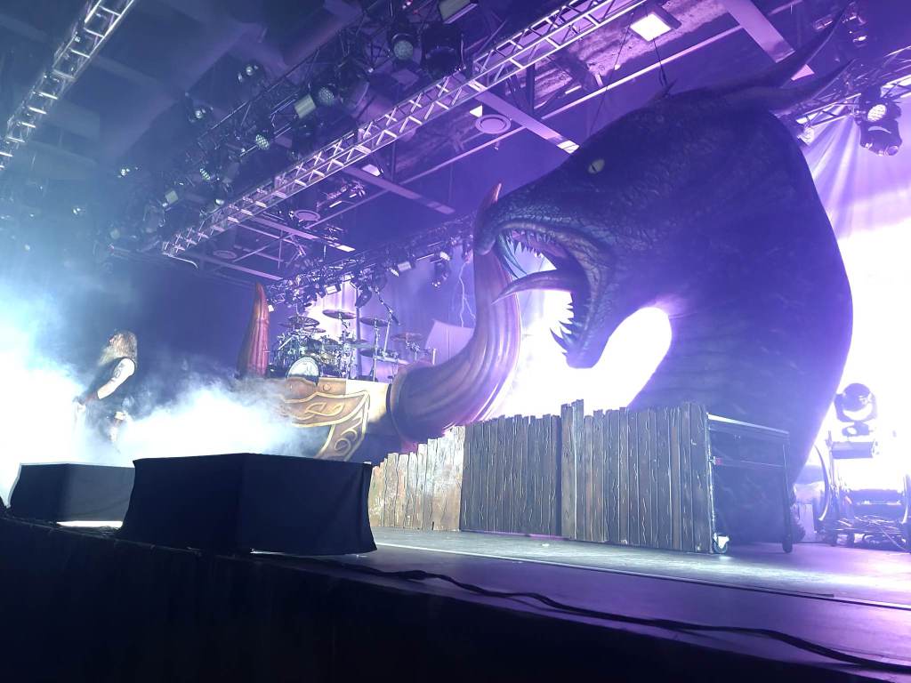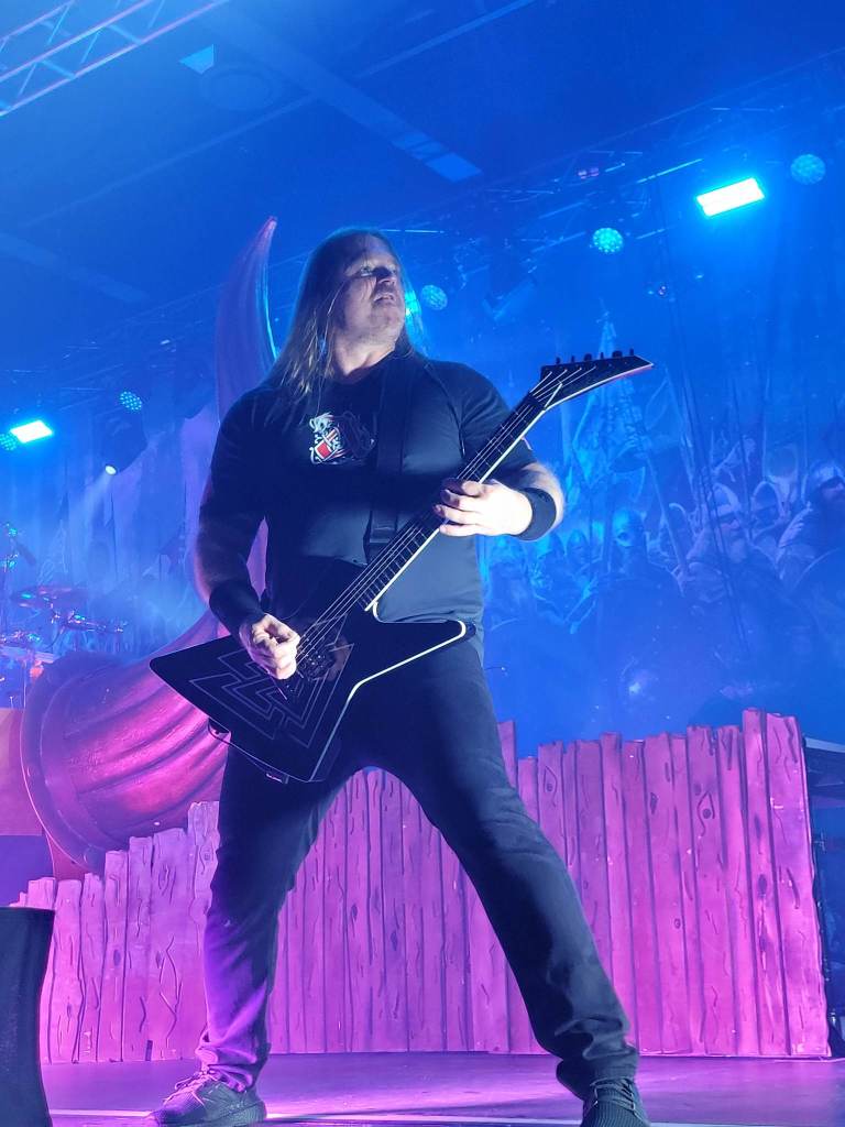 Of course, the energy could only remain as “Deceiver of the Gods” came up, and the lighting darkened. The emerald glow of two eyes peered through the shadow and fog of the stage, with Loki emerging before us. This brought the crowd into an uproar as soon as that signature riff started up.