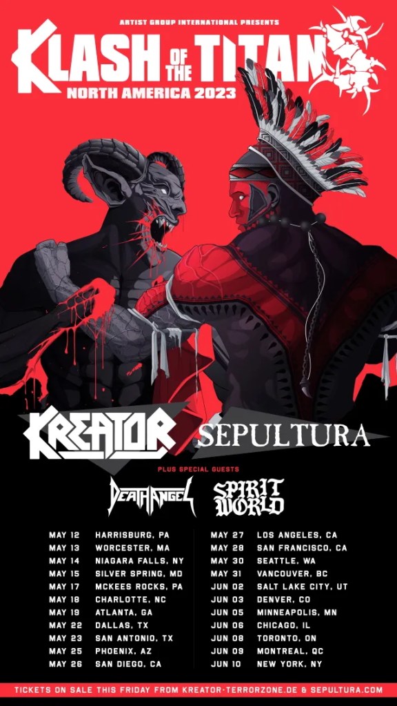 “I’m very excited to be back in North America with our friends and my personal idols KREATOR! They were a very strong influence in our early days, and it’s great to see they are stronger than ever, which is how I feel with SEPULTURA as well. It’s going to be a historical run. Thrilled to have our brothers from DEATH ANGEL and the awesome SPIRITWORLD with us. Do not miss this, metal is alive and well, so let’s celebrate ‘Klash Of The Titans North America 2023’ on the road! See you all soon!”