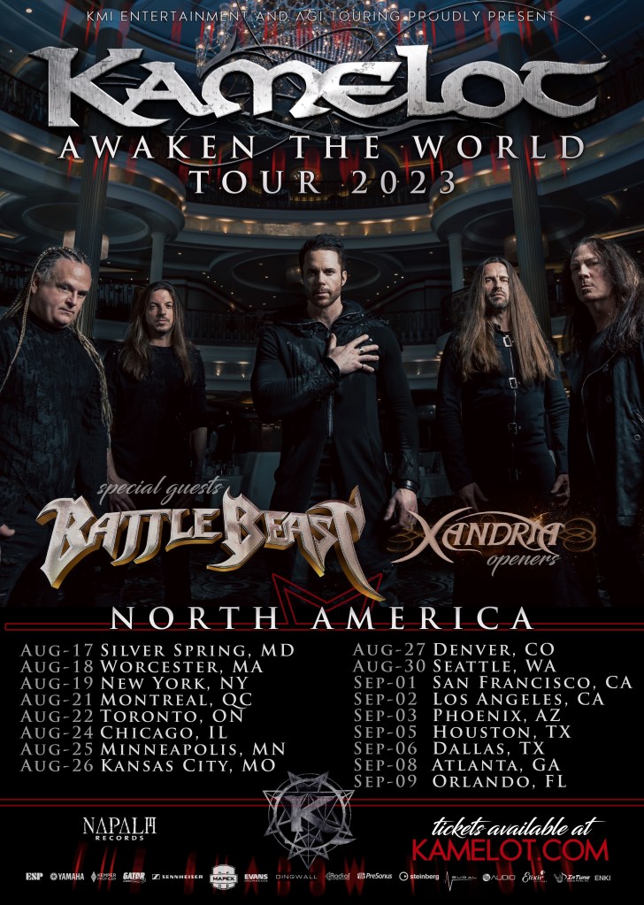 “We are beyond excited to return to North America for the Awaken The World Tour! We just returned from four weeks in Europe to packed houses, so we cannot wait to play new songs and the new set to the KAMELOT Nation US and Canada. Joining us on the journey will be our good friends and live legends Battle Beast from Finland, as well as our friends Xandria, who are returning to our shores to round off an amazing lineup. See you all at the shows!”